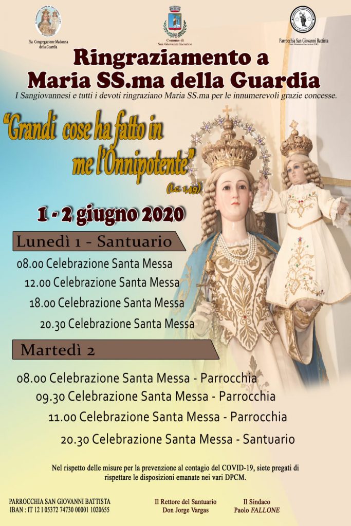Perdurando l’emergenza Covid-19 anche nella ricorrenza della Festa della Madonna della Guardia, il programma “tradizionale” è stato messo da parte e, il Consiglio parrocchiale insieme alla Pia Congregazione e all’Amministrazione Comunale hanno convenuto, straordinariamente e solo per quest’anno, di “trasformare” la tradizionale festa in un ringraziamento a Maria SS.ma della Guardia per averci preservato da questa epidemia dove nessuno dei nostri concittadini è stato toccato dal virus Covid-19.