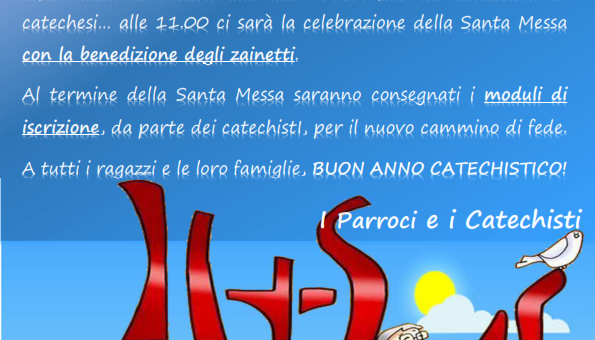 Domenica 1 Ottobre iniziamo il nuovo anno catechistico…. Vi aspettiamo in Chiesa alle ore 10.30 per un momento di catechesi… alle 11.00 ci sarà la...