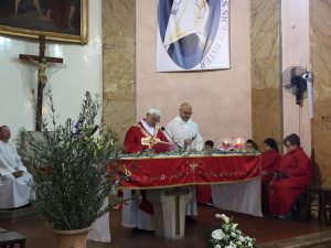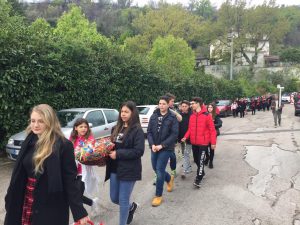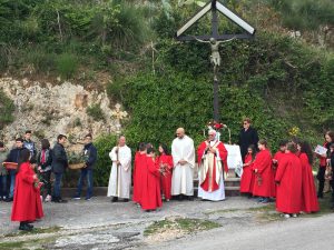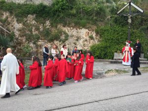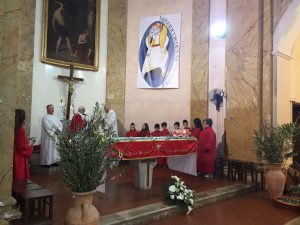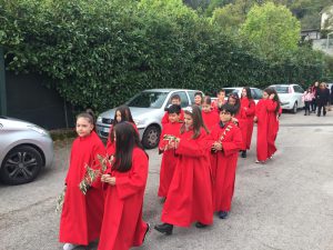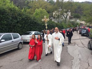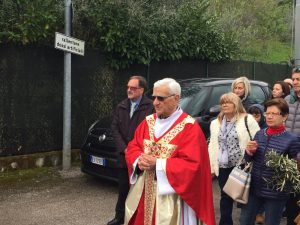 La Celebrazione è iniziata con la benedizione dei ramoscelli di ulivo nei pressi del Crocifisso sulla via che porta al Santuatio della Guardia. Terminato questo primo momento si è tenuta la processione d’ingresso nella Chiesa Parrocchiale dove è proseguita la liturgia con la lettura della Passione.
