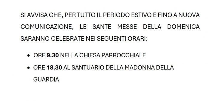 AVVISO 4 Agosto 2025 SI AVVISA CHE, PER TUTTO IL PERIODO ESTIVO E FINO A NUOVA COMUNICAZIONE, LE SANTE MESSE DELLA DOMENICA SARANNO CELEBRATE...